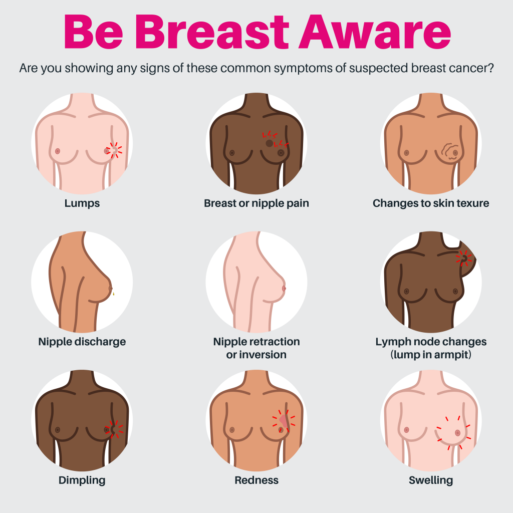 What are the signs and symptoms of breast cancer to be aware of?